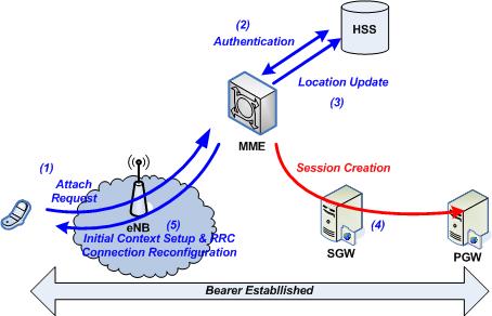 UE가 E-UTRAN에 연결을 요청하면 eNodeB는 selection 절차를 거쳐 특정 MME를 선택하고 UE의 요청을 전송한다. 수신받은 요청에 대해 MME는 HSS와 연동하여 연결요청을 시도한 UE를 인증한다. 인증이 성공적으로 완료된 경우, MME는 E-UTRAN으로부터 수신받은 정보를 바탕으로 UE Context를 생성하고 HSS에 해당 UE의 위치정보를 기록한다. 또한, MME는 bearer channel을 생성하기 위해 SGW와 PGW에게 data traffic을 위한 자원을 할당할 것을 요청하고, 마지막으로 E-UTRAN으로 그 결과를 전송한다. E-UTRAN은 EPC에서의 모든 절차가 성공적으로 완료된 후, 해당 단말에 대한 자원을 할당하고 bearer를 설립한다.