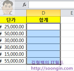 ① 결과를 구할 셀들(D2:D7)을 먼저 선택 선택합니다. 한 셀에 하나 이상의 값을 표시할 수 없기 때문에 합계를 구할 셀들을 미리 선택하고, 이 셀에 배열의 계산 값을 표시하도록 하는 것입니다.